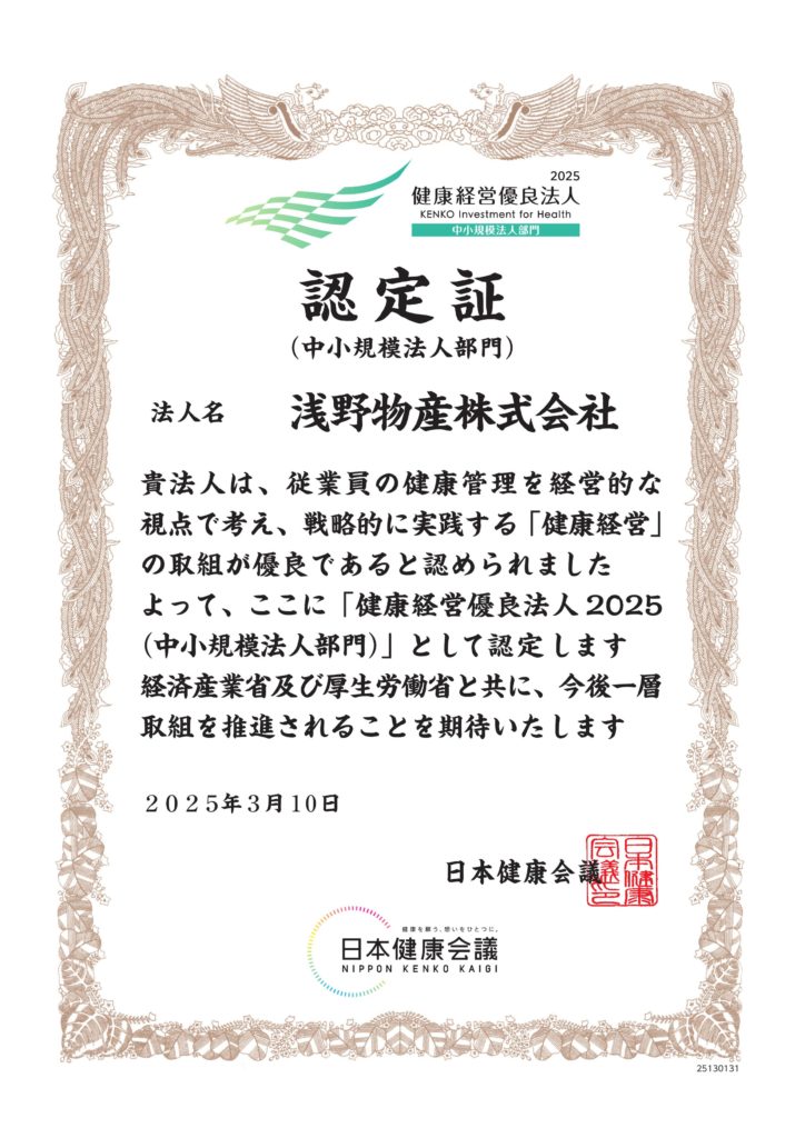 健康管理を経営的な視点で、戦略的に実践する「健康経営」の取り組みが優良であることが認められました。
